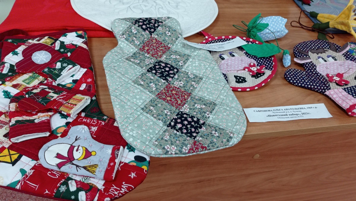 В читальном зале библиотеки оформили выставку ее работ: кухонные прихватки, одеяла, грелки для чайников, салфетки, коврики.